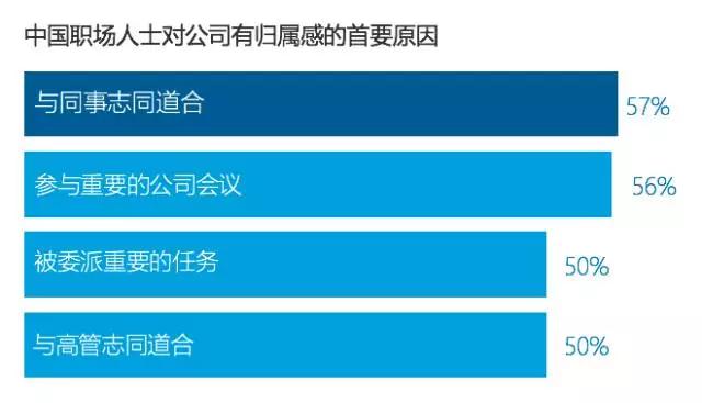 除此之外,中国职场人有着强烈的归属感需求。他们的归属感首先来自同事和公司高管,认为自己的工作水平、工作状态会通过同事、公司高管体现出来。57%的职场人认为,他们工作的归属感主要来源于志同道合的同事。