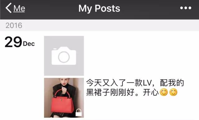 朋友圈:今天又入了一款LV,配我的黑裙子刚刚好。开心。。。(我还特地做了一个图,看我有多拼)