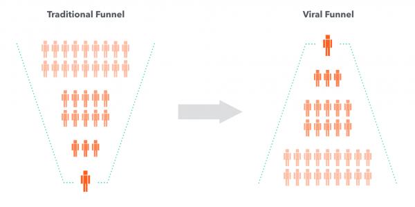 为了了解病毒式营销的本质,我们可以对比看下传统营销漏斗和病毒营销漏斗的区别: