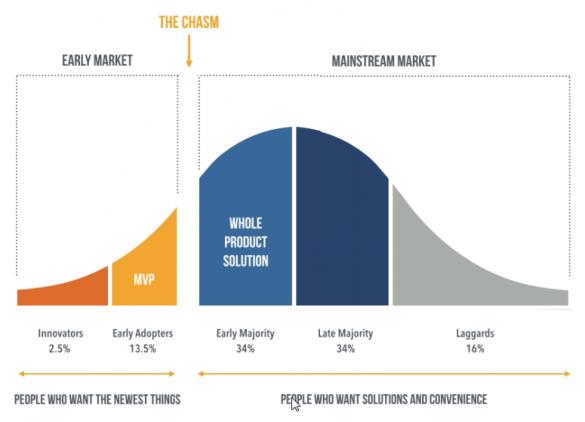 鸿沟存在于早期采用者和早期大众之间。一个整体产品(whole product)需要跨过这道鸿沟,在功能、界面、第三方产品和服务等方面得到认可和推荐,将产品推向广大用户。