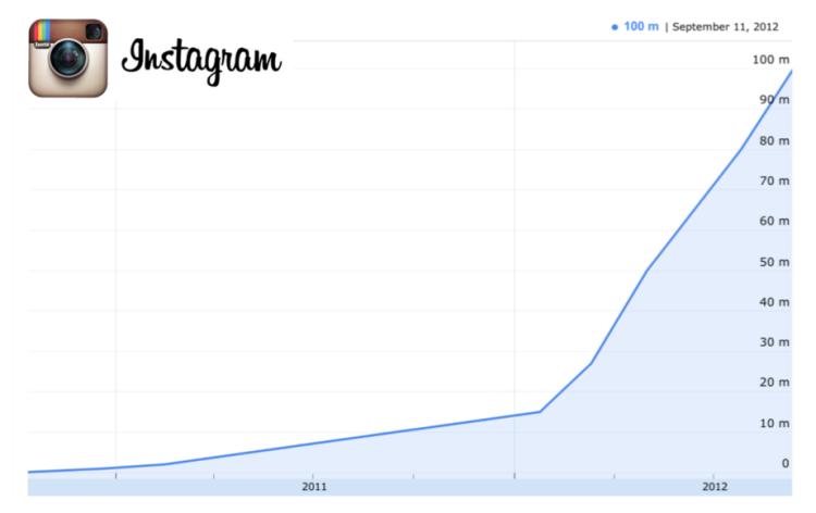 Instagram的跨平台发布功能让用户可以将照片发布到各个社交平台。在这个功能发布的2012年,Instagram的用户数实现了爆发式增长。如下图所示: