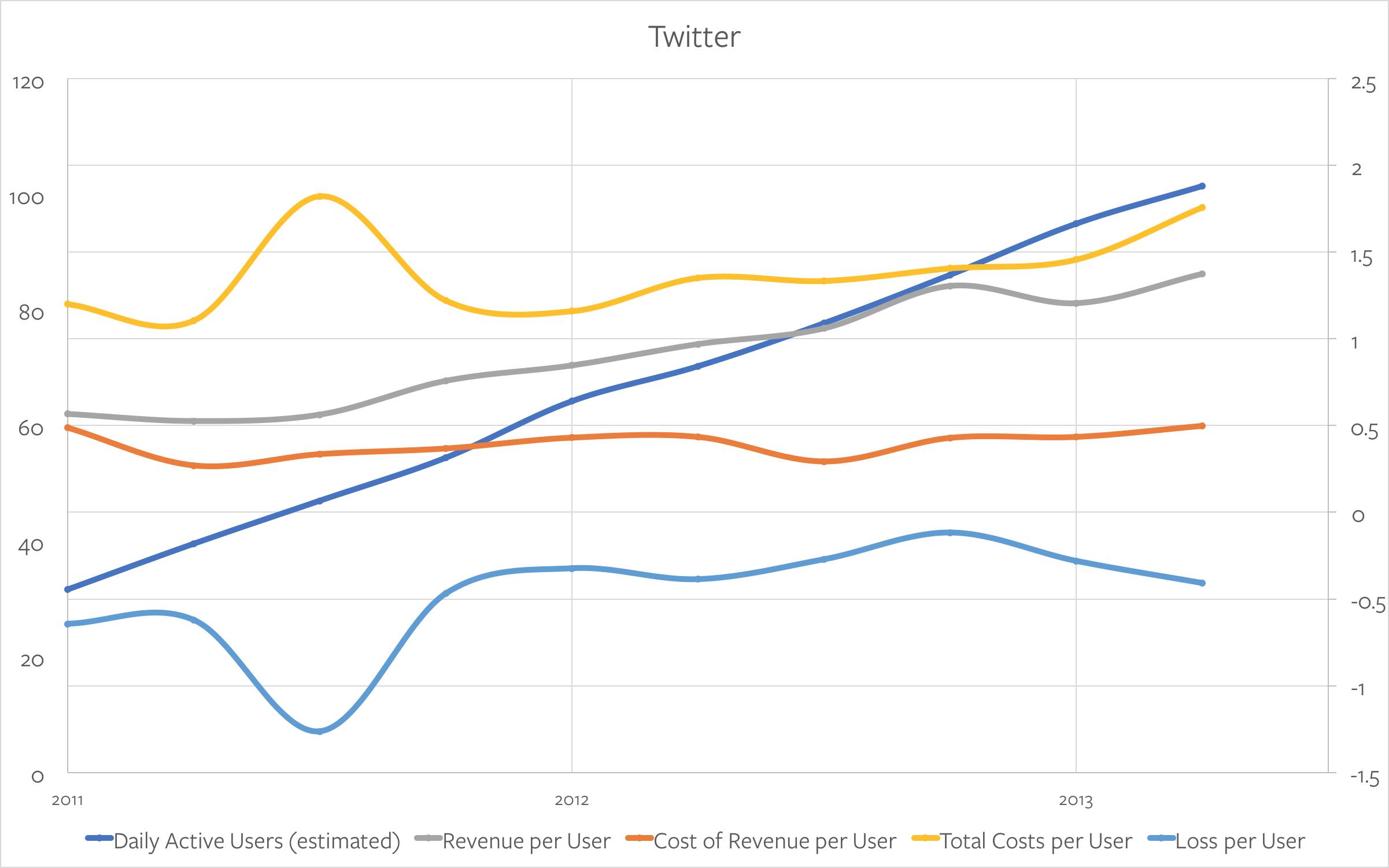 而IPO时候的Twitter,单用户收入成本基本持平,总成本高于Facebook。并且由于收购了MoPub,业绩在当时有一个短暂的提升。只要Twitter可以增加单用户的收入,或者是总用户数量,那么盈利就近在咫尺。如果两者都能做到,它也可以成为类似FB的社交巨头。