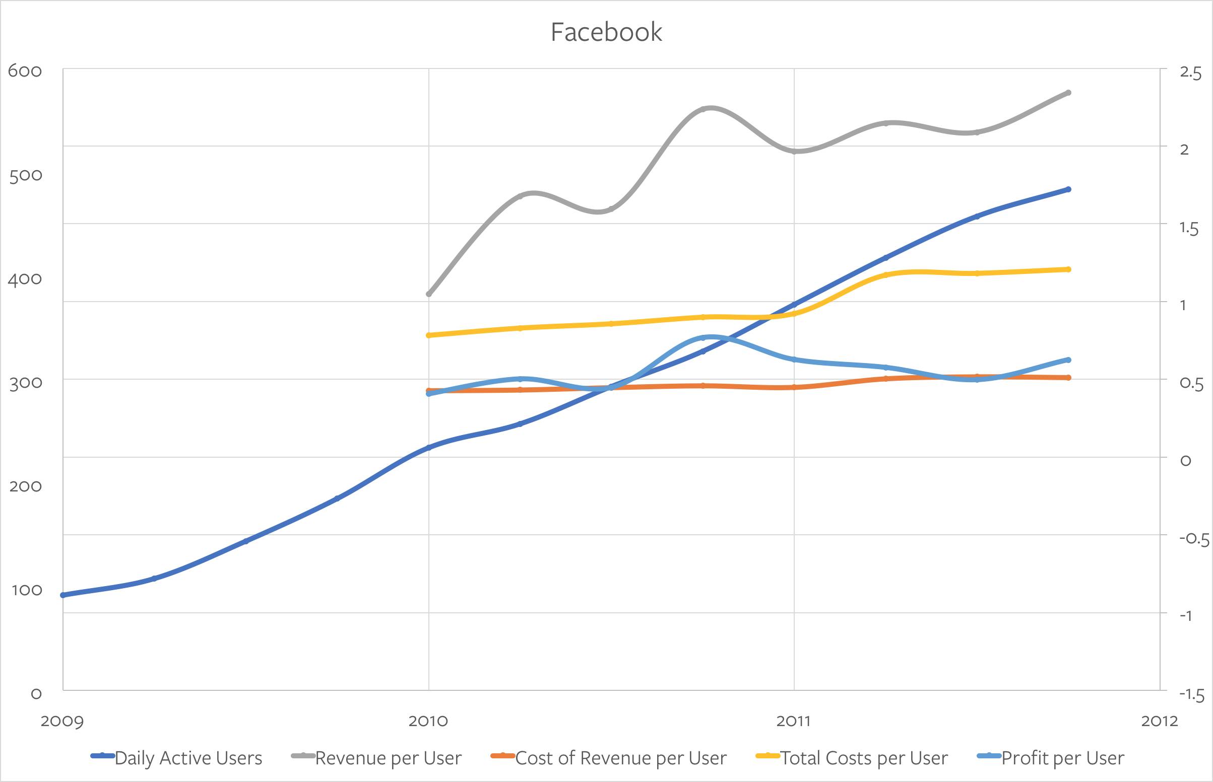 从图表上来看,Facebook的单用户收入成本保持稳定,这意味着每个新增的用户成本与先前获取的用户的成本大致相同。FB的影响力在当时并没有增大,但也没有减少。与此同时,总成本只是略有上升,这意味着Facebook单个用户的成本略高于以前(可能是因为2011年中期的大量收购导致),但情况基本可控。