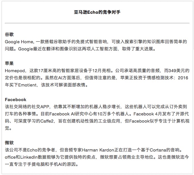 刚发布时,谈不上竞争:Google Home直到2016年10月才出现。囿于智能手机的语音助手,如苹果的Siri和微软的Cortana,面临一个大瓶颈:没有人愿意在公共场合与AI对话。