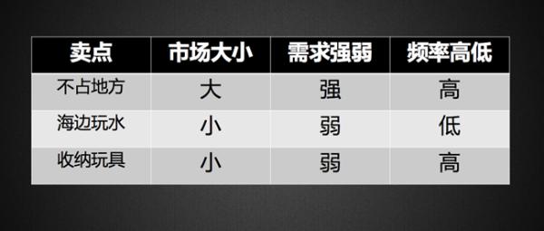显然,可折叠不占地方市场大,需求强,频率高,是王牌卖点,值得重点说,说透,其他相对不重要,可以说得少,篇幅小。这样分析下来,即使不做大量调研,也能获得比较靠谱的结论。