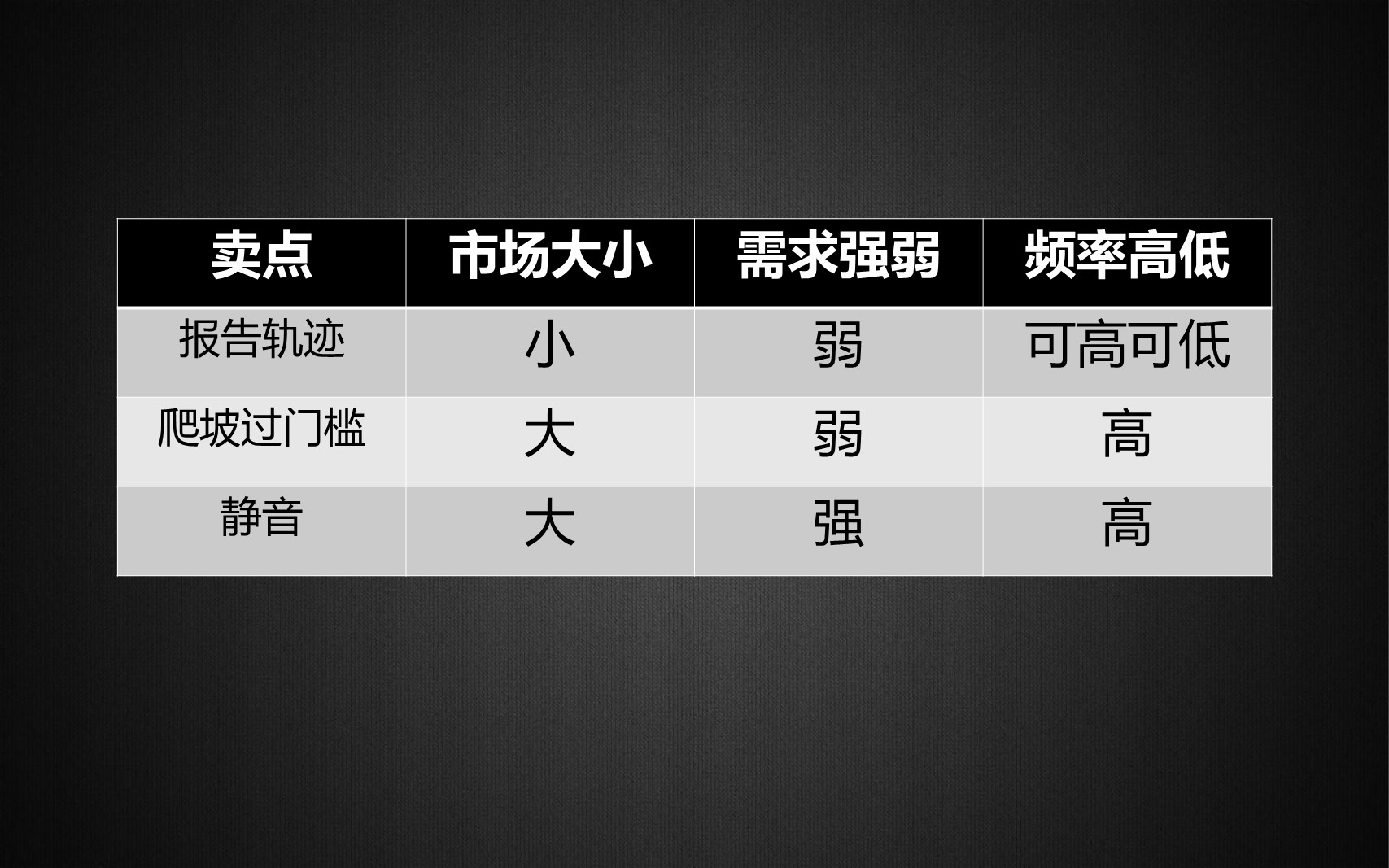 你可以很快就发现,APP报告功能和爬坡过门槛功能,只对部分家庭有用,而静音这个卖点,对所有人都有用,谁不讨厌噪音?需求也很强,频率也高, 毕竟每次扫地都需要它安静。于是把这些填进表格里——