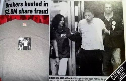 2003 年,金融经纪人 Igor Kotlyar 因金融诈骗被捕时,恰好身穿一件经典 Supreme T 恤。于是,Supreme 在同一年就拿那张新闻照片做了件 T 恤,名为“Illegal Business Controls America”。