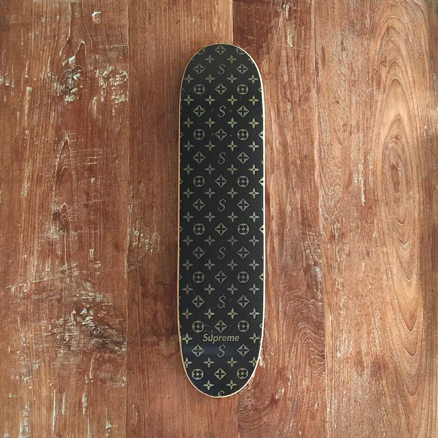 那时,Supreme 在一款滑板底布满了 LV 标志性图案,并将其中的“LV”改为美金符号“$”。然后,LV 就把 Supreme 告得要把产品召回了。不过,那时带嘲讽意味的作品显然更有 Supreme 感。