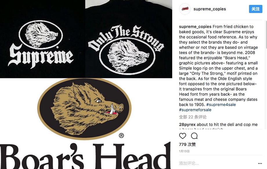 在 Instagram 上,名为“supreme_copies”的账号专注于寻找每件 Supreme 背后的“借鉴”来源,虽然解读不一定准确。