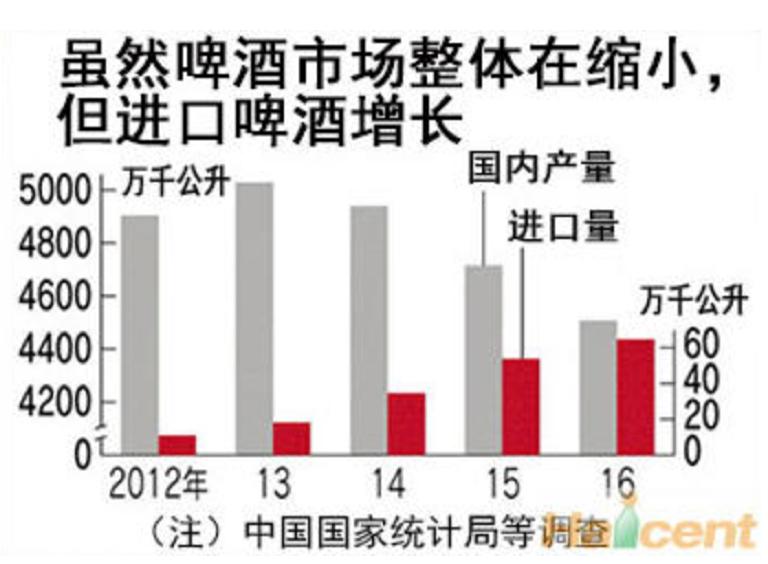 根据中国啤酒网的数据统计,2013-2016年,在中国啤酒市场产量不断减少的同时,进口啤酒量不降反增,2016年超过了60万千升(升等同于公升),相比2014年翻了1倍。今年上半年,中国进口啤酒量已达到40万千升,同比增长7.1%。