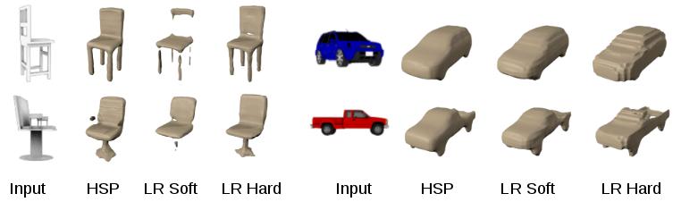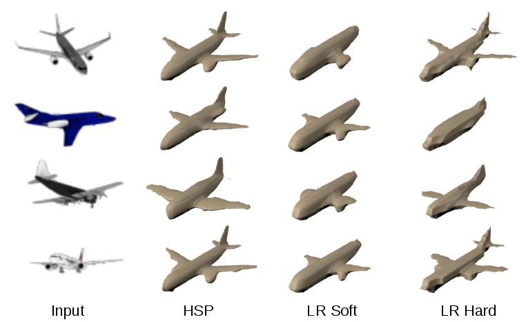 我们的实验主要是基于合成的ShapeNet数据集,我们研究的主要内容是根据一张单色图像,预测出其中对象的高分辨率的几何图形。我们将我们的方法与两个基准线——“硬低分辨率”(LR hard)和“软低分辨率”(LR soft)——做了对比,这些基准线都是323的分辨率进行预测的,但是它们在训练数据生成的方式有所区别。LR hard基准线为立体像素使用的是二进制赋值,如果至少有一个相应的高分辨率立体像素被占用了,那么所有的立体像素都会被标记为已占用。而LR soft使用的是分数赋值,在相应的高分辨率的立体像素中显示已占用的立体像素的百分比值。我们HSP的预测方法是在2563的分辨率进行预测的,下图中的数据反映了高分辨率预测与低分辨率基准线相比,在图形表面质量以及完整性方面的优势。你可以在我们的技术报告中找到更多的数据结果和相关的实验。