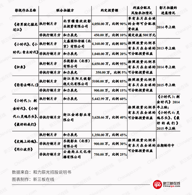 新三板在线从和力辰光招股说明书中获悉,和力辰光获取《老男孩猛龙过江》制片收入500万元;《归来》、《爸爸去哪儿2》获取制片收入1701.70万元,《爸爸去哪儿2》广告分账收入255.15万元;《师父》获取销售收入452.83万元,并向其提供器材租赁服务,获取销售收入145.63万元。为电视剧《北平无战事》提供宣传推广、辅助发行等服务获取收入970.87万元,其他服务性收入396.80万元。