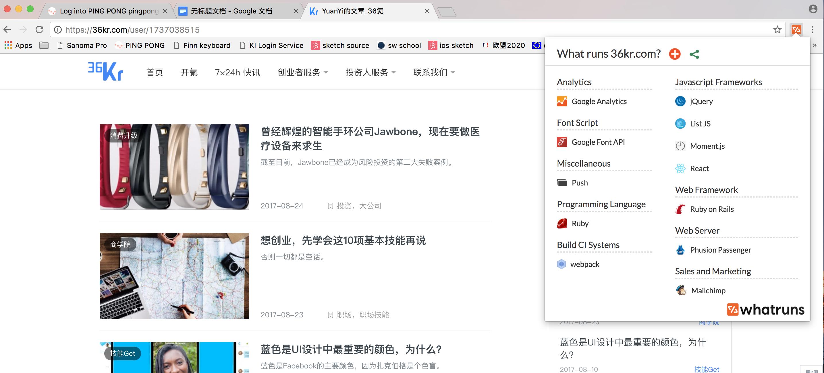 截图:使用What runs 分析的36kr 网站