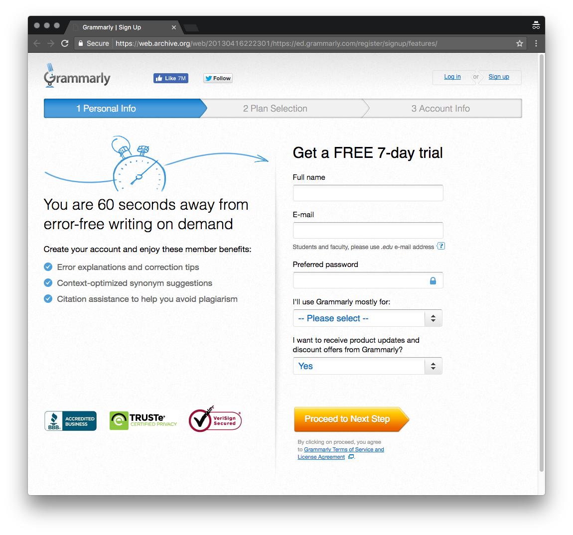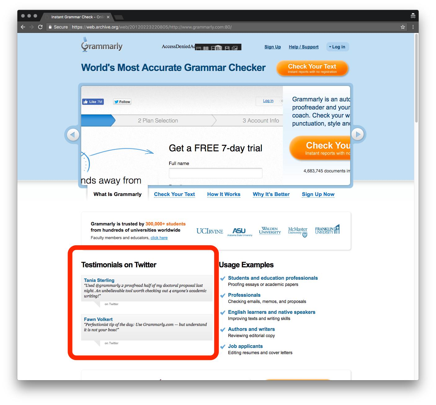 2013年:Grammarly开始调整登录页面,以瞄准更广阔的市场。登录页面上的标语写着“世界上最好的语法检查器”,并表明了“300万人信任”(而不是简单的学生)。与此同时,Grammarly在Facebook上发展了超过100万名粉丝。