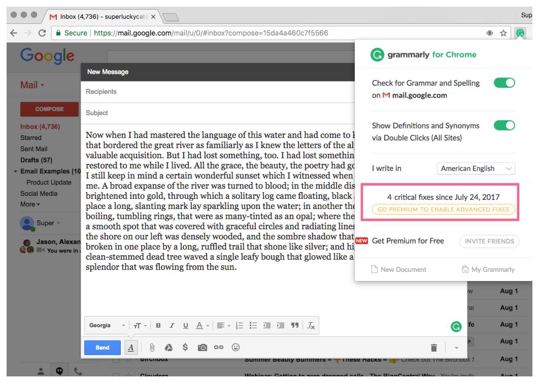在浏览器中,Grammarly的Chrome扩展程序向用户展示免费计划,以及有多少更多的功能,来促进用户的转化。