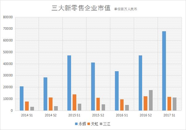 永辉的市值一直都将天虹和三江购物远远的甩在身后。在2016年下半年新零售概念提出后,三大企业纷纷有所响应,市值较2016年上半年都有很大幅度的提升,其中永辉和三江的上升更为迅速。除了有新零售的助攻外,三江在2016年下半年获得阿里巴巴投资的21.5亿元,自11月18日消息宣布后,三江购物曾连续涨停七天。