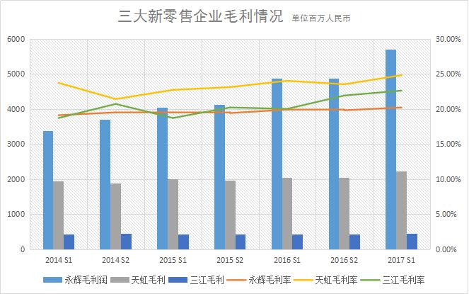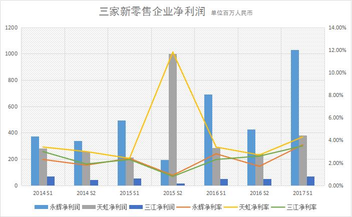 2017年上半年,三家净利润和净利率都有非常大的提升。永辉净利润10.55 亿元,同比增长57.57%;天虹的净利润3.75亿元,同比增长31.36%;三江的净利润为0.66 亿元,同比增长31.32%。招商证券零售行业首席分析师许荣聪称,三江购物目前仍处于门店调整期,同时公司通过优化供应链的方式使毛利率得以显著提升,毛利率改善也拉动了净利率和净利润增长。
