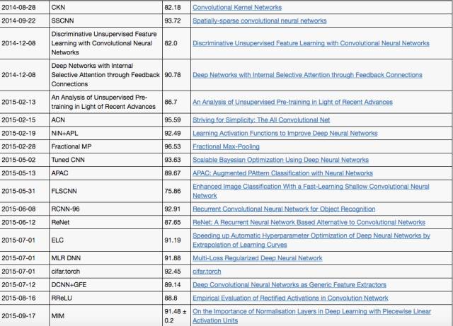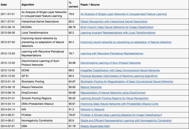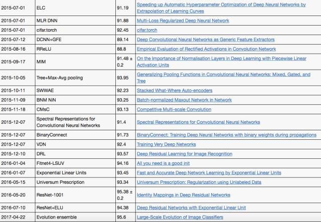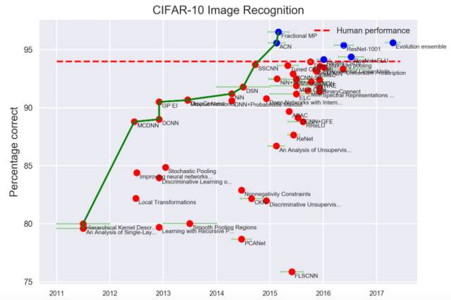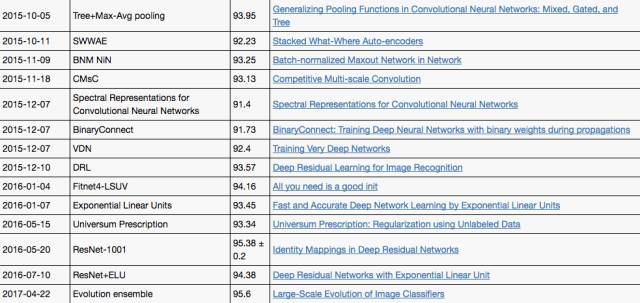 CIFAR-10 中,取得达到人类水平的突破也是发生在2015年之后。下面是具体的算法和准确率: