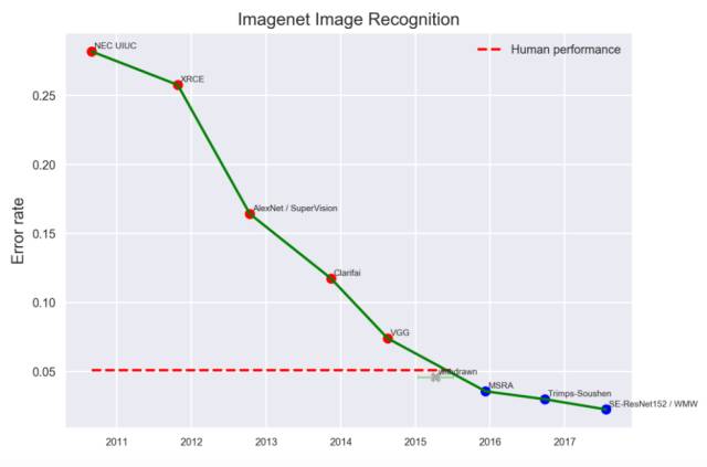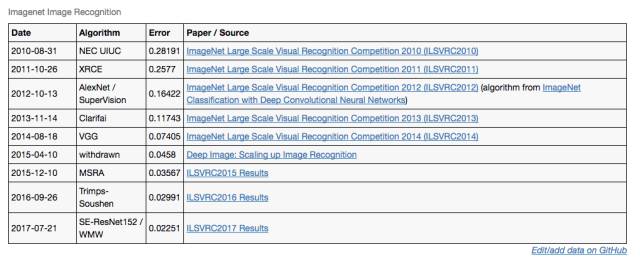 EFF的统计表中列出了从2010年到2017年,ImageNet图像识别竞赛中取得突破的情况。2014年的VGG和2015年的MSRA是两大比较有代表性的突破,其中2015年MSRA的突破,正式将机器对图片的识别错误率降到了人类水平。