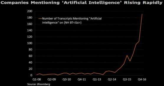 一些软件已经被证明在识别图像中的汽车或猫等对象上能比人做得更好,谷歌的AlphaGo软件已经战胜了多个围棋冠军 ,此前这被认为是需要十年或以上的时间才能实现的。各大公司都急切地希望基于这些进步获得发展,在各家企业的财报电话会议上,AI 被提及的次数更是呈现指数级的增长。