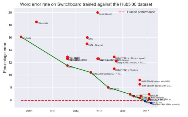 注:微软最开始宣布语音识别错误率为6.3%,一个月后宣布达到5.9%,最近一次宣布错误率已经降到了5.1%。