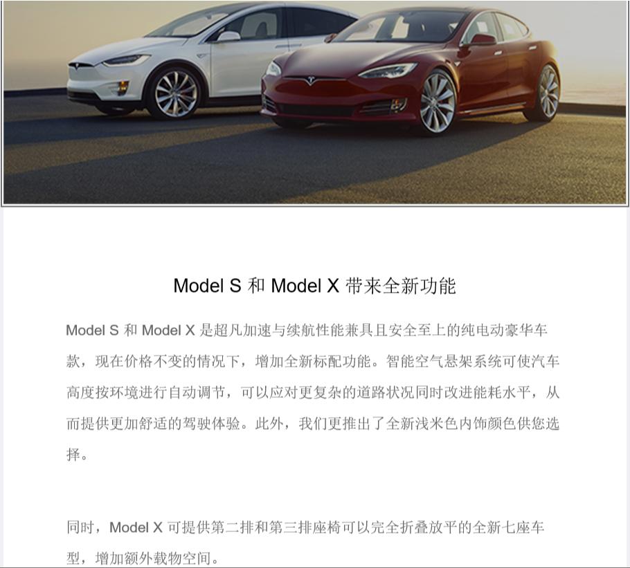 8月24日晚,特斯拉向中国区客户发送了一份邮件,表示「价格不变的情况下,增加全新标配功能。智能空气悬架系统可使汽车高度按环境进行自动调节,可以应对更复杂的道路状况同时改进能耗水平,从而提供更加舒适的驾驶体验。」在这之前,智能空气悬挂的选配价格是2500美元。(约人民币1.6万元)