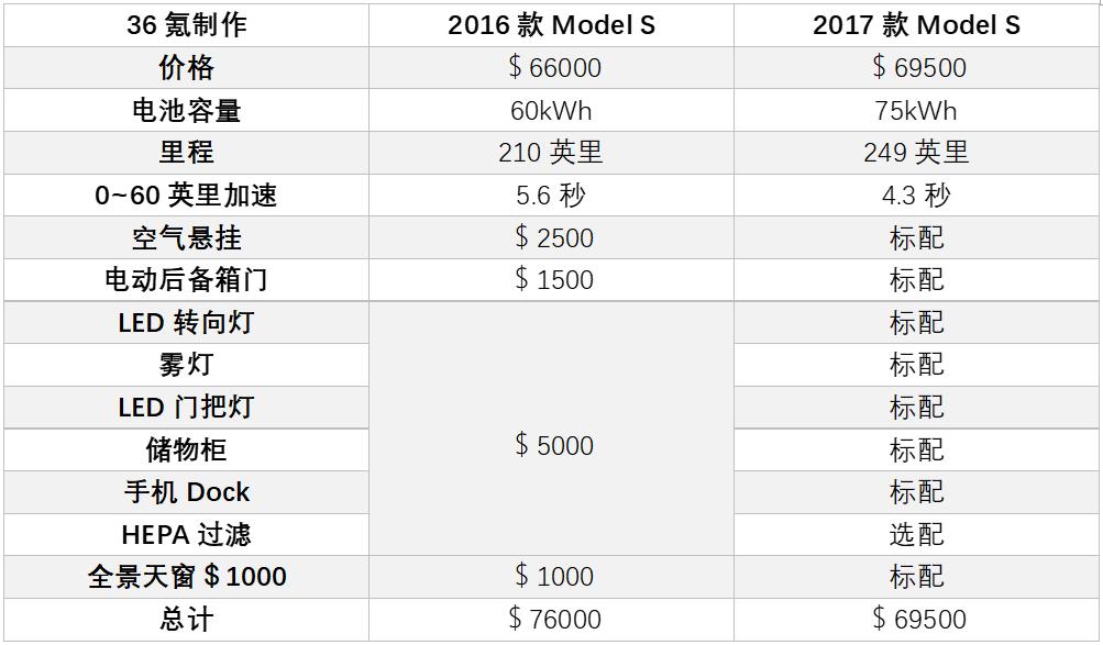 知乎上一位ID为「Ryan Woo」的网友总结了2016款和2017款入门级Model S的配置/售价变化(特斯拉没有按年限区分过车型,这里只为说明一年间Model S配置/售价的变化)