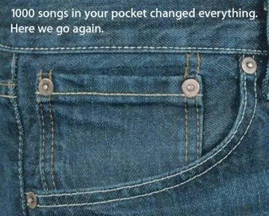 2005年9月,苹果第一代iPod nano的发布会邀请函设计相当“撩人”,甚至有一些当年发布第一代iPod时的感觉,当时的邀请函上写着“1000首歌曲在你的口袋里面改变一切”的字样。就在大家都认为这次发布会将发布可以听歌的牛仔口袋的时候,乔布斯却从牛仔裤的零钱袋里面拿出了iPod nano。