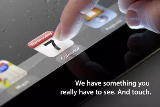 2012年的发布会邀请函明确展示出了iPad的一角,同时有一根手指在点击3月7日的日历,右下角则是一句话“我们这里有些你们必须来看一看、摸一摸的东西”(We have something you really have to see. And touch)。