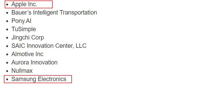 现在打开加州DMV官网的相关页面,可以看到三星电子排在牌照获批名单的最下方,不远的上方还有它在消费电子领域相爱相杀多年的老对手苹果的身影。