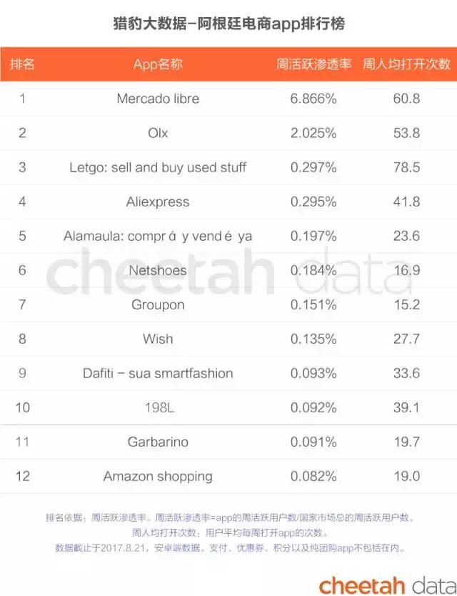 在猎豹大数据排行榜中反复出现的app,有Amazon Shopping、AliExpress、Mercado Libre、Wish等。