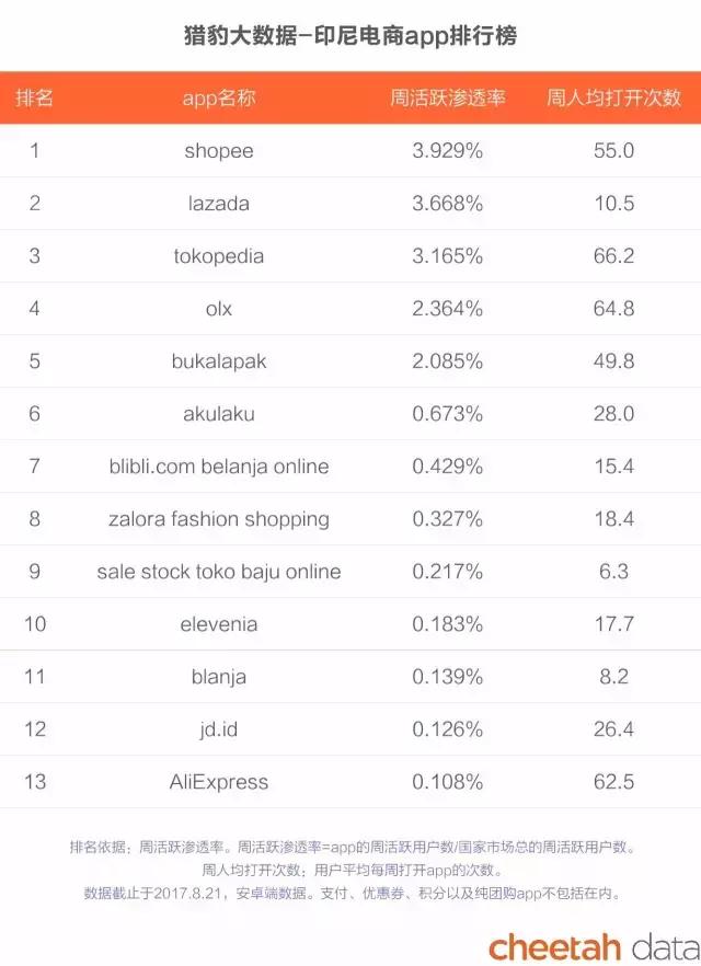“猎豹大数据”显示,截至2017.8.21,在印尼的电商市场,第一阵营依次为Shopee、Lazada和Tokopedia。