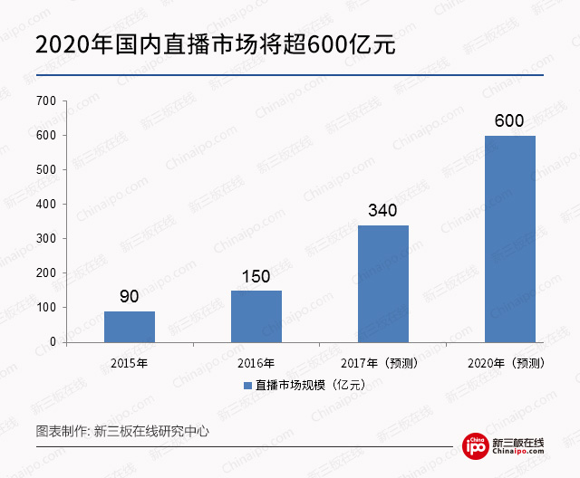 2、根据预测,2017年直播行业市场规模将达到340亿元。2020年我国的直播市场预计超过600亿元,较2016年底150亿元增长约3倍。