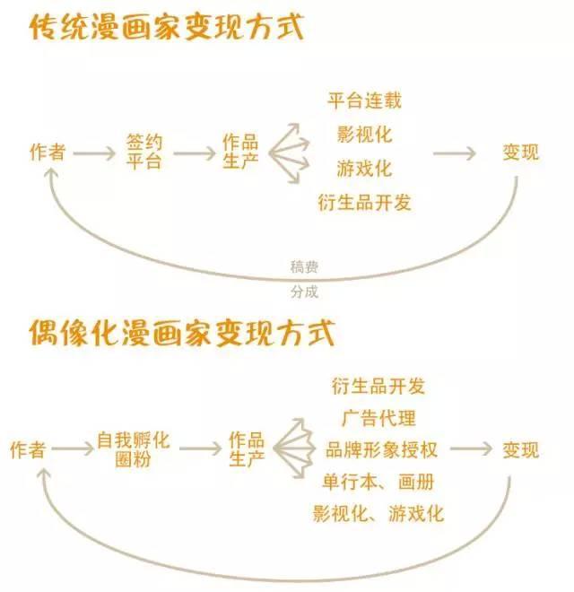 使徒子是网红漫画家的代表之一,关于网红漫画家36氪也曾报道过牛轰轰和丁小点,当然免不了曾经刷屏朋友圈的伟大的安妮。他们的优势是自带粉丝,有一定的用户粘性。不过跟自媒体一样,面临如何变现和规模化的问题,根据使徒子的一次分享,他认为网红漫画家的变现方式比传统漫画家更多,路径也不尽相同,后者可以通过广告代理和品牌形象授权等方式变现。