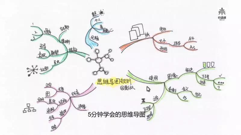 如果真正讲思维导图的绘制方法,只要五分钟就能讲清楚,甚至这张图就能够全部讲明白。它的基本绘制原有以下几点: