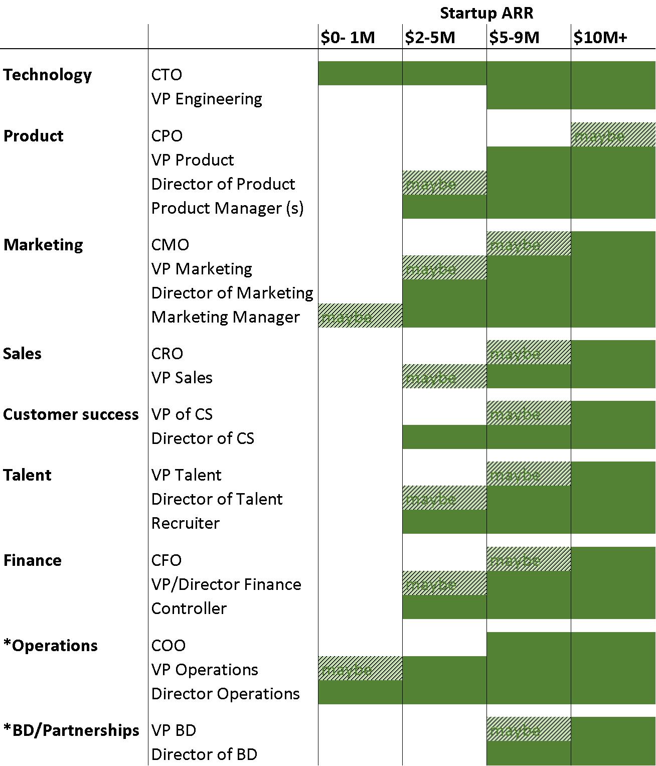 *运营:许多初创公司不需要运营功能。除了那些需要提供服务、考虑资源和机载能力的网络服务企业之外。这样的公司可能从成立COO(首席运营官)开始。如果不是,那么雇佣一名相对资深的运营人员就很重要。为了不把问题搞砸,通常这个角色需要真正有经验的人来避免让客户或供应商遭遇自己的能力盲区。而在设备/房地产、法律或人力资源等领域,副总裁财务或财务总监可以担任“运营”的角色。