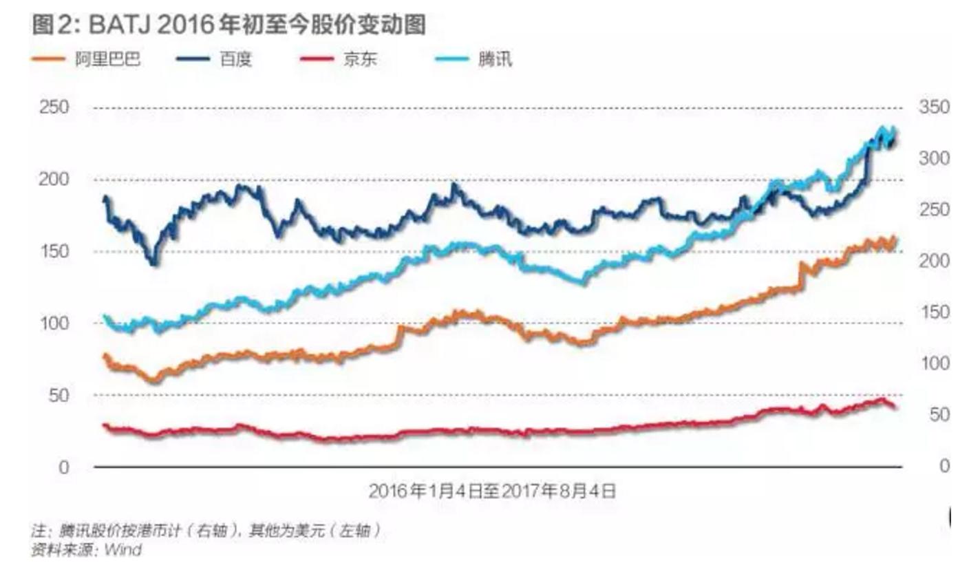 中国科技股也类似,阿里巴巴、腾讯、京东股价都创历史新高,百度也达到了近五年来的次高点。高盛在2017年6月发出的研究报告中提示了科技股下行风险。