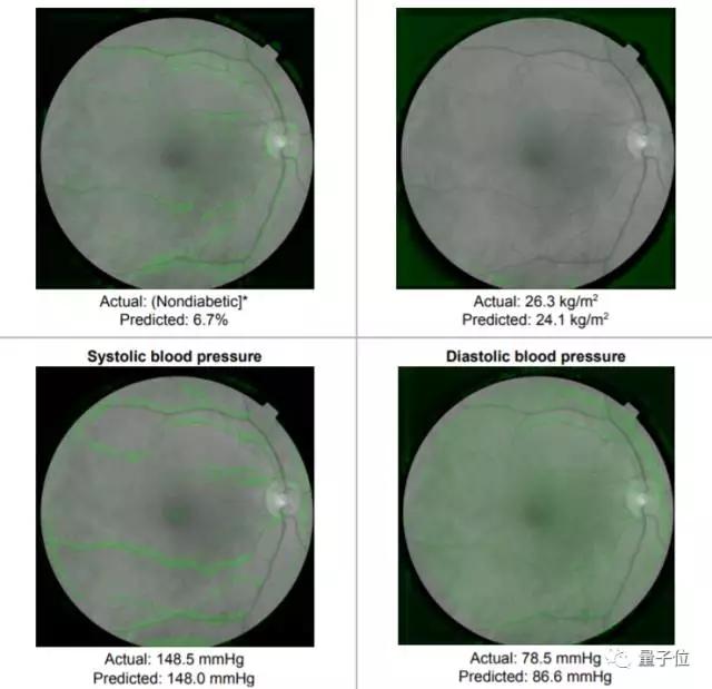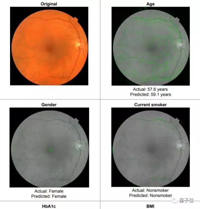 论文结尾,研究人员给出了系统预测的结果与真实情况的对照信息。我们可以看到,通过AI分析视网膜的结果,与真实情况大致相同。