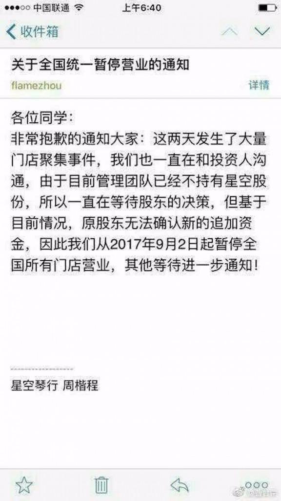 除了从星空琴行员工处流出的关于“目前管理团队已经不持有星空股份,所以一直在等待股东的决策,但基于目前情况,原股东无法确认新的追加资金,因此从2017年9月2日起暂停全国所有门店营业”的CEO内部说辞外,关于学费、押金等如何处理的问题,没有任何说法。
