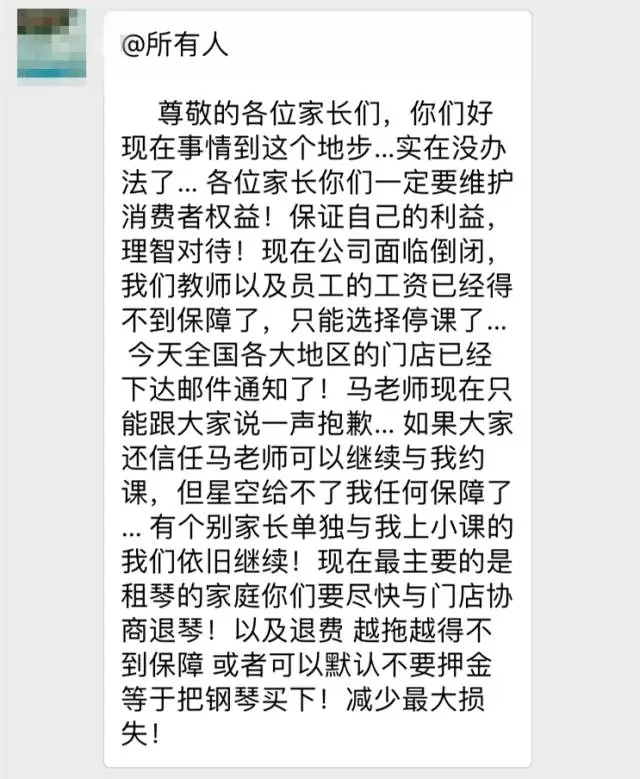 今年2月,“疯狂钢琴突然关张,数百人为学费抓狂”的新闻曝光:经营六年多的疯狂钢琴在2月7日停止经营,一天后将北京现存的5家门店同时关闭,拖欠教师工资社保和学员学费。令人感慨的是,疯狂钢琴在关门前两天依旧在招生营业,学员们组成的维权团队早已超过400多人,涉及被骗总金额在百万元以上;还有部分教职工表示近2个月没有拿到工资,社保也被断缴……已公布的联络人发言称,疯狂钢琴近年来入不敷出,欠下千万债务,而原本注册资本只有三百万,因为无力继续经营遂决定闭店并申请破产,没有事先通知学员是为了保全资产,便于清算。