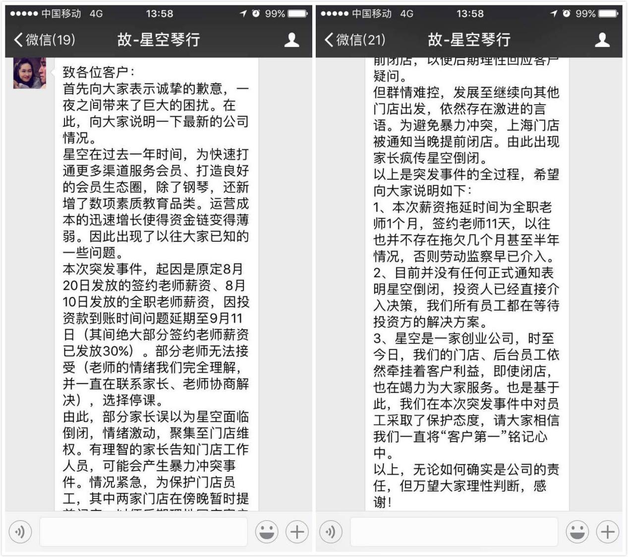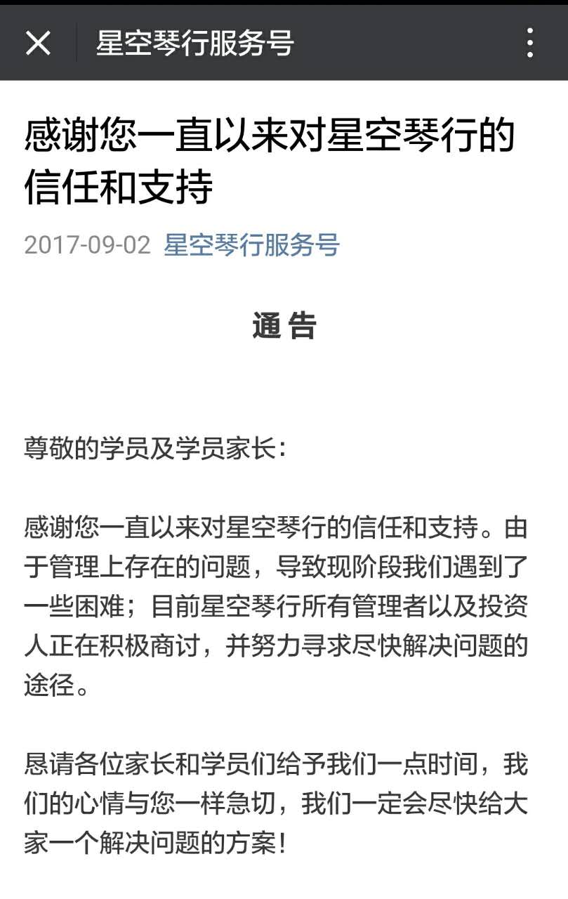 星空琴行CEO周楷程发出内部邮件通知,原股东无法确认新的追加资金,因此从9月2日起暂停全国所有门店营业。官方态度上,除了9月2日通过微信公众号发出的一份通告之外,星空琴行对外再无任何信息。“教师们普遍被拖欠2个月的工资,之前店里领导曾表示会在9月11日发放。”星空琴行北京某校区的一位兼职教师称。