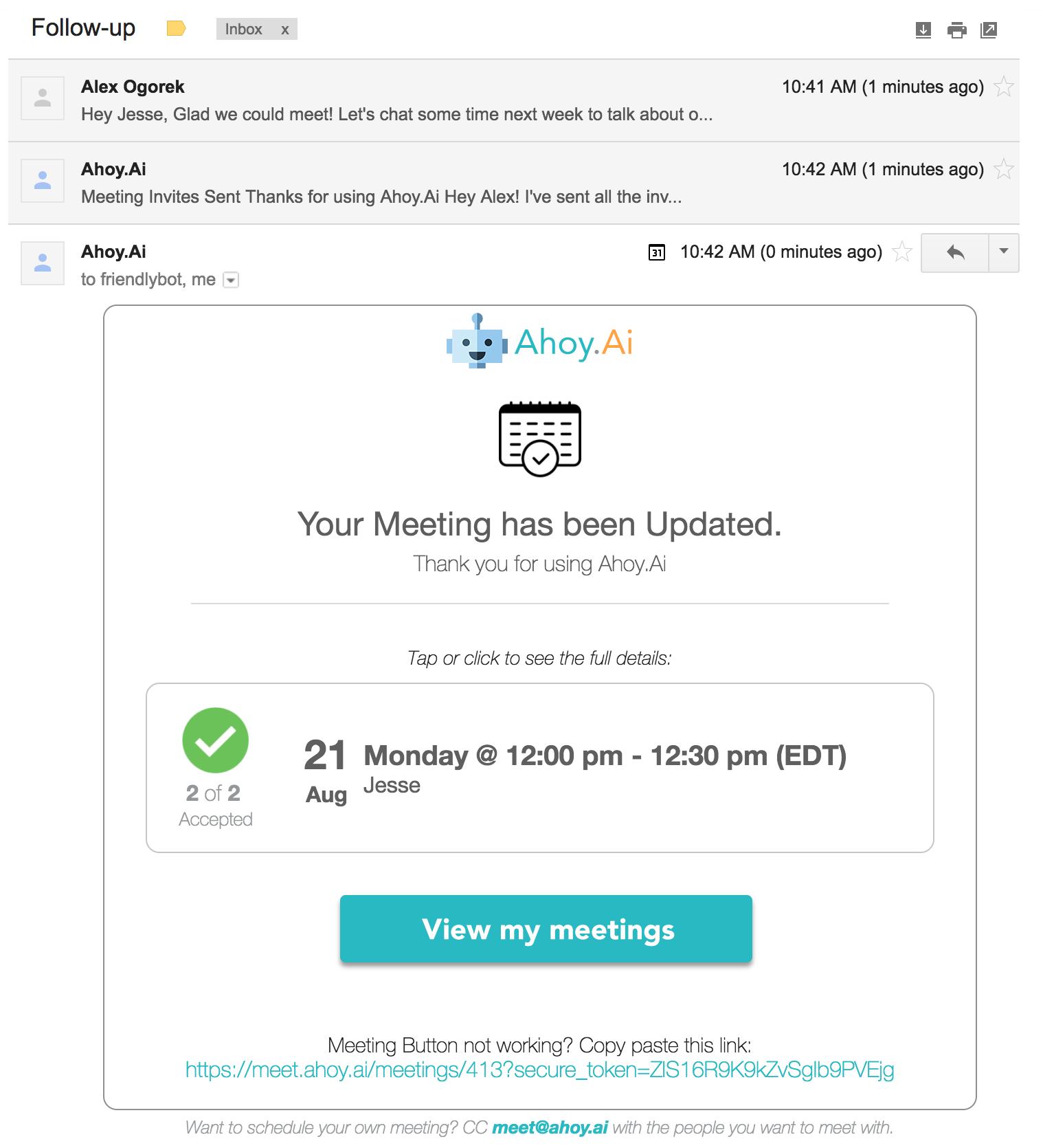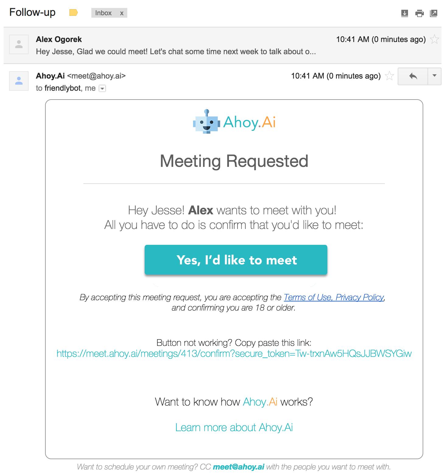 美国的一个大学生想要利用人工智能解决这个问题。他们做了一个Ahoy.Ai,这是一个可以自动帮你安排日程的机器人。据官网上所写:Ahoy.Ai automatically schedules and manages meetings for you with just 1 email(Ahoy.Ai可以用1封邮件就搞定会议的安排。)