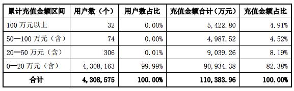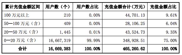 2016年度,按累计充值金额区间列示的用户数量及充值金额合计情况