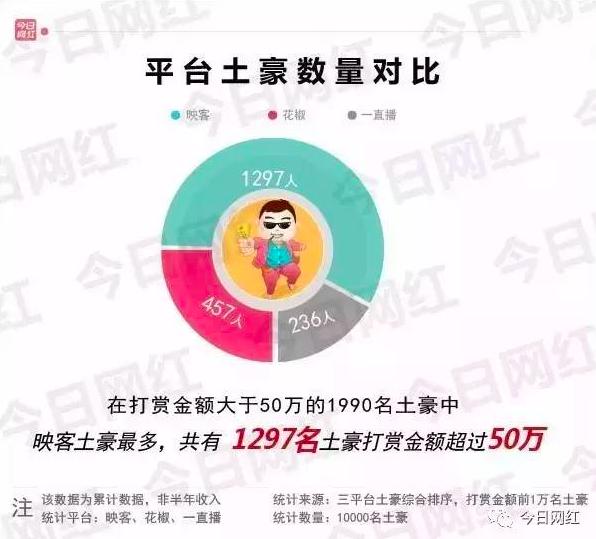 而且今日网红发布的数据显示,在映客、花椒和一直播三大直播平台上,在打赏大于50万的1990名土豪中,映客土豪最多,共有1297名,花椒和一直播分别为457人和236人。这些数字再一次证明,映客是一家非常有钱的直播公司,而且重要的是要学会抱土豪的大腿啊。