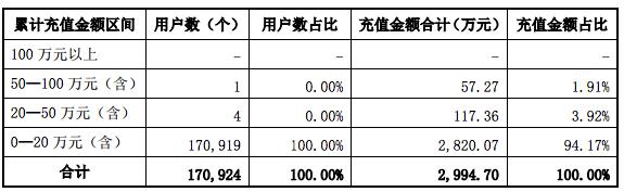 2015年度,按累计充值金额区间列示的用户数量及充值金额合计情况