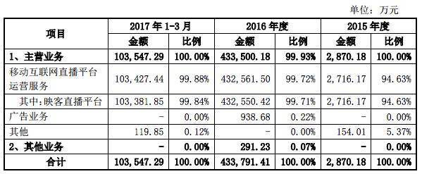 根据公告,映客2016年的营收为43.37亿元,净利润为4.8亿元,映客2017年第一季度的营收为10.35亿元,净利润为2.4亿元。据介绍,映客主要盈利模式是移动互联网直播平台运营服务收入和广告收入。其中,映客开设了充值及虚拟礼物赠送功能, 用户可以通过充值购买钻石,以钻石购买虚拟礼物并同步打赏主播, 映客及主播对用户打赏形成的收益按照约定进行分成。
