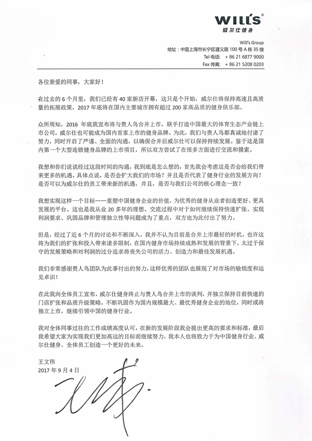 以下是贵人鸟公告全文,和威尔士董事长王文伟内部公开信。