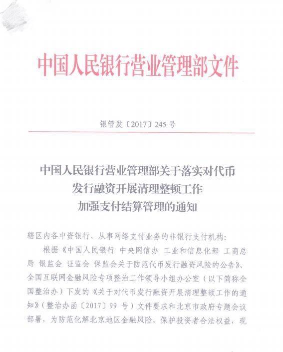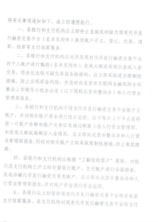 在这份名为《中国人民银行营业管理部关于落实对代币发行融资开展清理整顿工作加强支付结算管理的通知》中,央行要求各银行和支付机构停止为现有代币发行融资交易平台提供账户开立、登记、交易、清算、结算等支付结算服务,同时对代币发行融资交易平台的个人账户进行甄别,必要时采取限制措施。