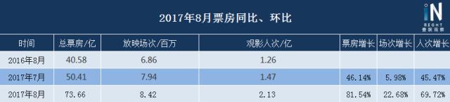拓普电影智库提供给壹娱观察的数据显示,在刚刚过去的8月,总票房达到了73.66亿,创造了中国电影市场单月票房的纪录。这个数字环比上月增长了近50%、同比去年增长了81.54%,放映场次、观影人次也创造了今年的新高。