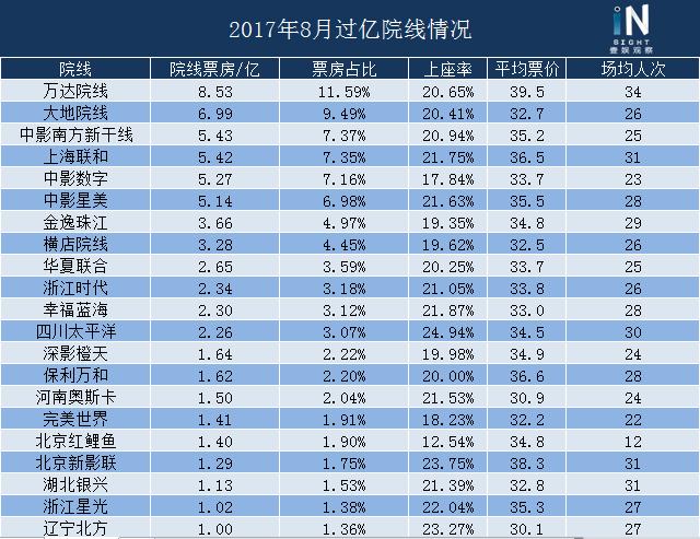 8月创纪录的单月票房,也使得该月票房过亿院线达到了21家,比7月多了7家。在票房过亿院线top10里,万达院线作为头名揽下8.53亿,占比为11.59%。